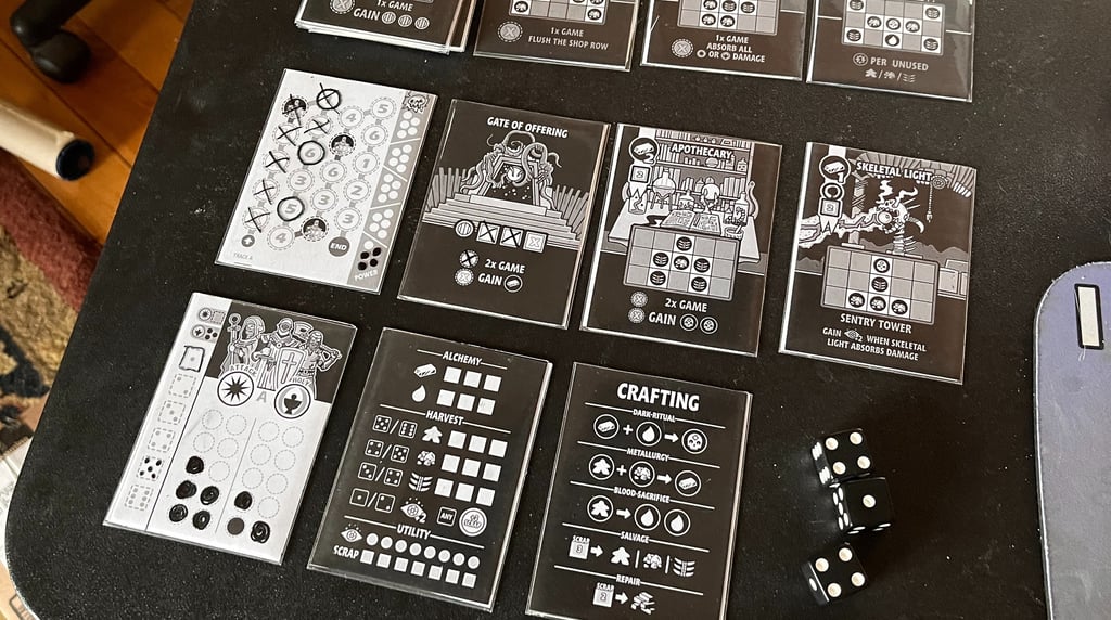 Drawing on surfaces is one of my favorite aspects of modern roll and writes, and I love it when games incorporate using dry erase on small player boards. Since the surface of card protectors is dry eraseable, I decided to start tinkering with making small card-based roll and write prototypes where writing on the cards is a core mechanic. As you might imagine, this pairs exceptionally well with print and play.