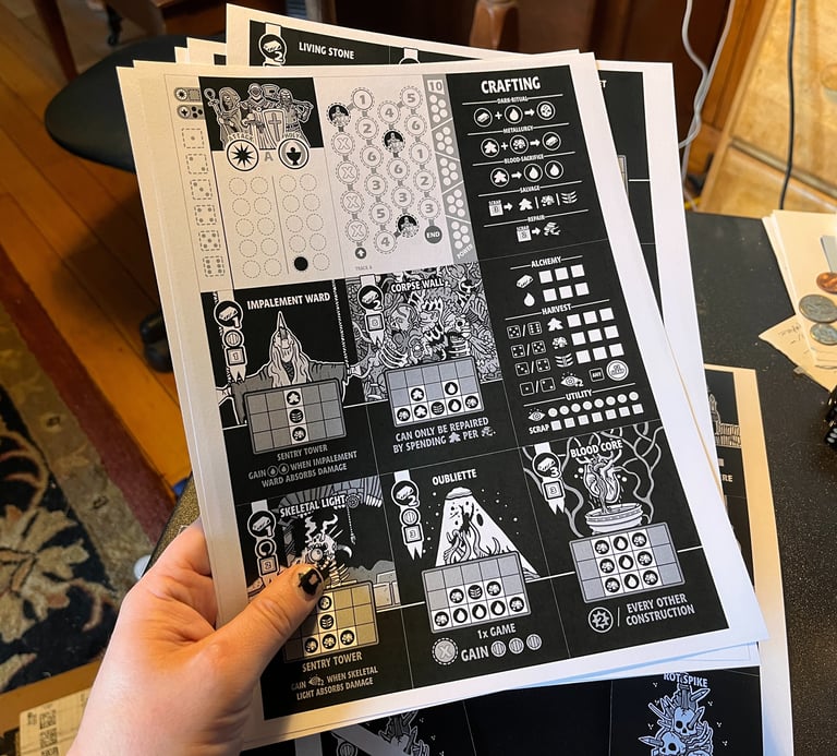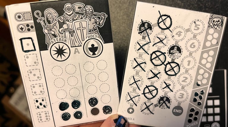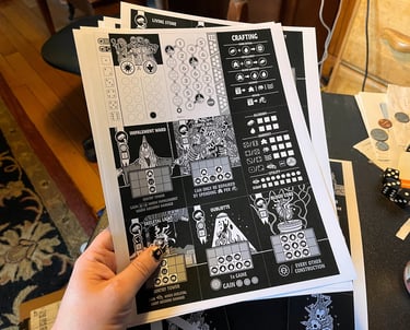 Even before tariffs sent board game manufacturing into a tailspin, I was spending a lot of time thinking about how to make games without the high overhead. This led me deeper into the realm of roll-and-write games, which I have a great fondness for. Being able to print something out, grab some dice and tokens, and play a game feels very punk af. Inspired, I started designing a handful of games with print and playability as the core focus, which led me to trying out some weird things.