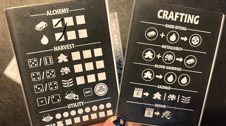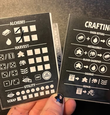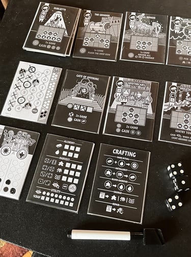 Over the course of multiple rounds, you'll purchase structures and work to complete them by spending and crossing out resources on the cards with the dry erase marker as you go. The autistic completionist in me finds this aspect of the gameplay particularly satisfying. When all of the necessary resources for a building are crossed out, you flip the card over and get to use it in your fortress. The base game has 14 buildings, but you'll rarely get to build more than 6-7 in a single game, so there's a lot of variability there. I'm also working on an 18 card expansion that'll have more buildings and some special cards that modify the game in different ways.