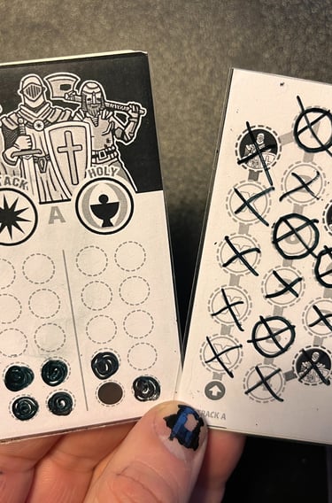 Then, if you are on a crusader rally point circle on the progress track, you'll draw circles around the matching rolled number spaces ahead of you on the next section of the track to indicate which rounds you'll get attacked.